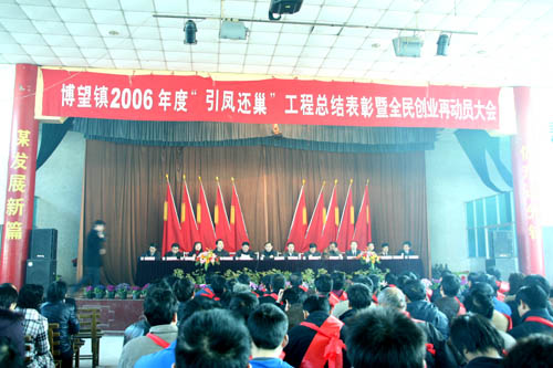 2007年2月26日上午9時(shí),博望鎮(zhèn)2006年度“引鳳還巢”工程總結(jié)表彰和全民創(chuàng)業(yè)再動(dòng)員大會(huì)在博望文體中心隆重舉行,當(dāng)涂縣縣長(zhǎng)操隆山、縣委常委、博望鎮(zhèn)黨委書(shū)記張清、鎮(zhèn)長(zhǎng)劉國(guó)寶等出席了大會(huì)并作了重要講話。會(huì)議對(duì)2006年度“引鳳還巢”和全民創(chuàng)業(yè)兩大工程中涌現(xiàn)出的各類(lèi)先進(jìn)集體、先進(jìn)個(gè)人予以了表彰并對(duì)2007年的工作進(jìn)行了全部的部署。