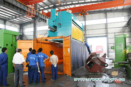 這套大型機(jī)床主機(jī)由兩臺250噸6米的數(shù)控板料折彎機(jī)組成,可實(shí)現(xiàn)單機(jī)及雙機(jī)聯(lián)動(dòng)工作的功能,極大的方便了大型生產(chǎn)中的多元化要求。機(jī)器總重達(dá)50余噸,可完成12米的工件,對裝箱的操作技術(shù)要求很高,但由于我們機(jī)械化的車間及熟練的技術(shù)人員,裝箱過程雖然繁瑣但并不費(fèi)力。由于整機(jī)超高超長,采用的是兩個(gè)開頂箱,將兩臺主機(jī)分開來裝。考慮到機(jī)器要在海上航行近一個(gè)月,裝箱的工作人員做足了防護(hù)措施:底部鋼條固定,兩側(cè)鐵絲固定,外加透明塑料膜,頂部自制框架固定并套上雨布等等,以免在運(yùn)輸過程中造成對機(jī)器不必要的損壞。
