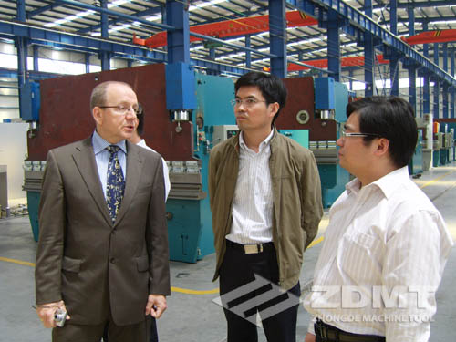 在整個的參觀過程里, EDWIN先生了解了我們先進的工廠全程監(jiān)控系統(tǒng),寬敞明亮的工作車間以及外形簡潔優(yōu)雅的產(chǎn)品。相信在韓總流暢的英文翻譯下,EDWIN先生一行對本地區(qū)剪折行業(yè)的發(fā)展?jié)摿σ欢ㄓ辛诵碌恼J識。同時,我們很感謝韓總和EDWIN先生,他們站在一個全新的角度,對中德機床提出了建設性的建議。我們也希望中德機床精益求精,同ESTUN公司和DELEM產(chǎn)品建立更緊密的關系,將中德機床推向更廣闊的市場。